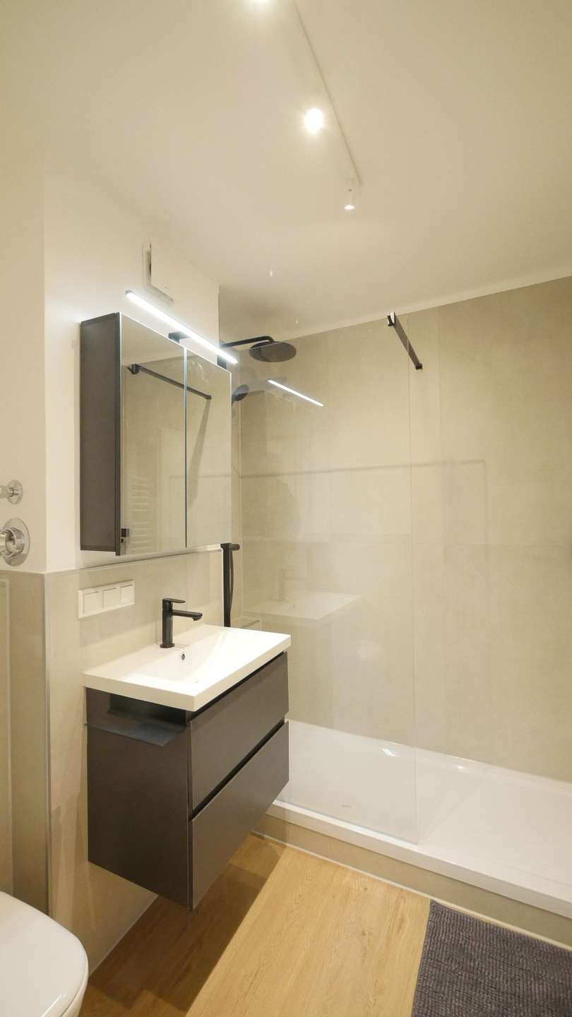 Das innenliegende Badezimmer ist modern und ansprechend. Es ist mit 120 x 60 cm großen hellen Wandfliesen gefliest und mit hochwertigen Sanitärobjekten ausgestattet. Der Duschbereich ist mit Echtglas abgetrennt. Das Duschsystem besteht aus einer Duschstange, Rainshowerdusche, einem Duschkopf und einer Armatur. Zur weiteren Ausstattung gehören ein Waschtischunterschrank, ein Spiegelschrank mit Leuchte und ein Handtuchheizkörper.