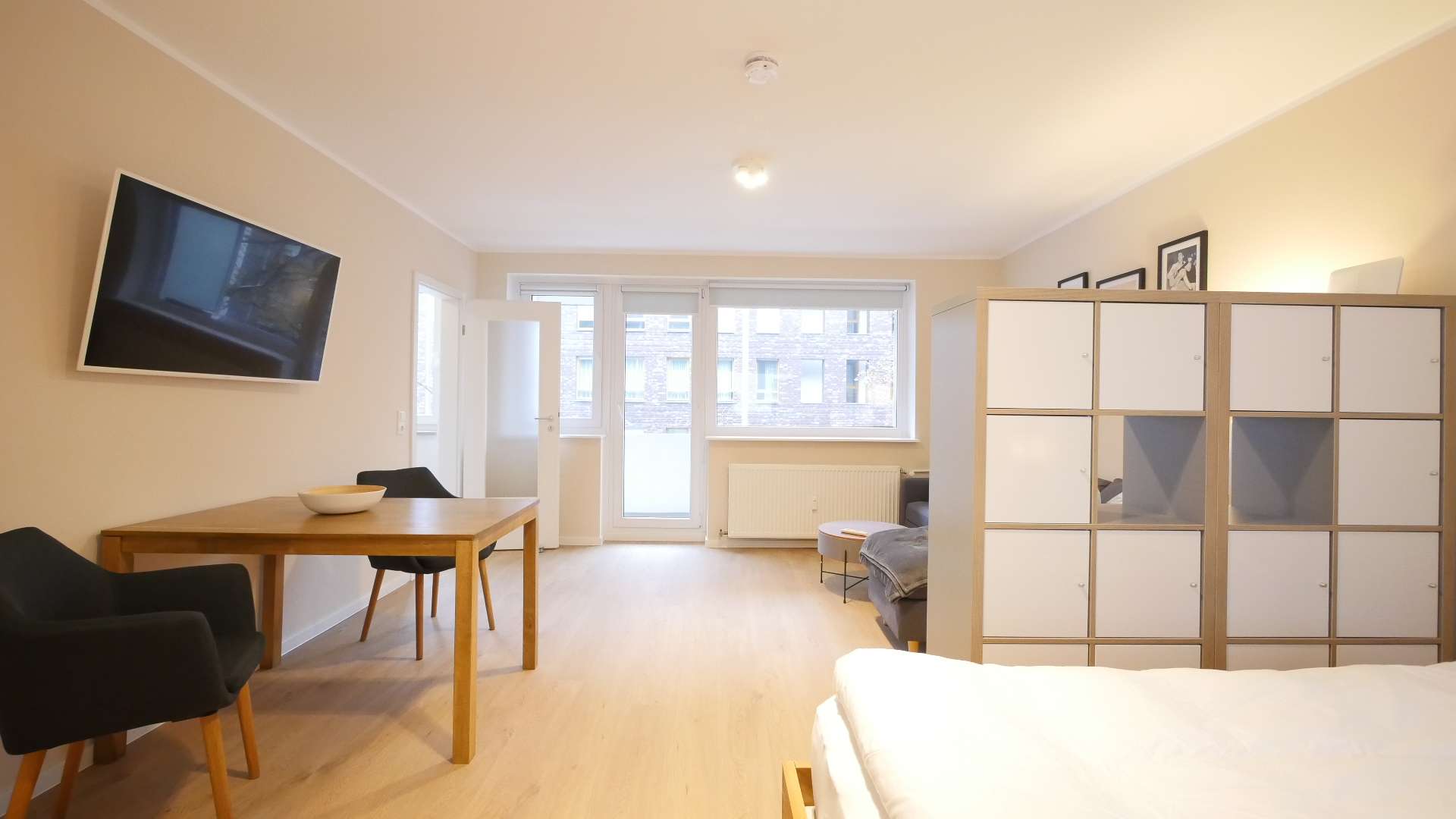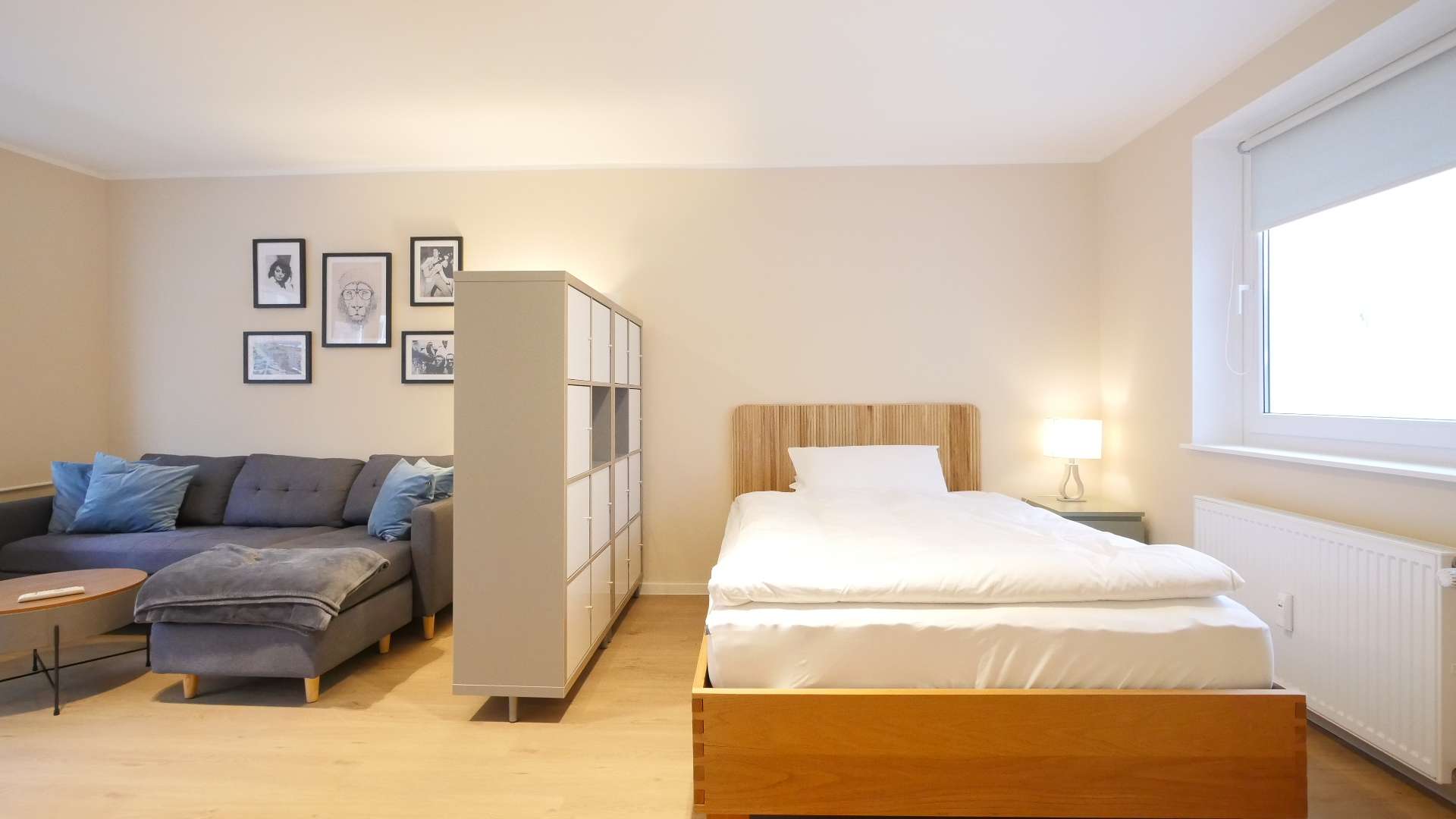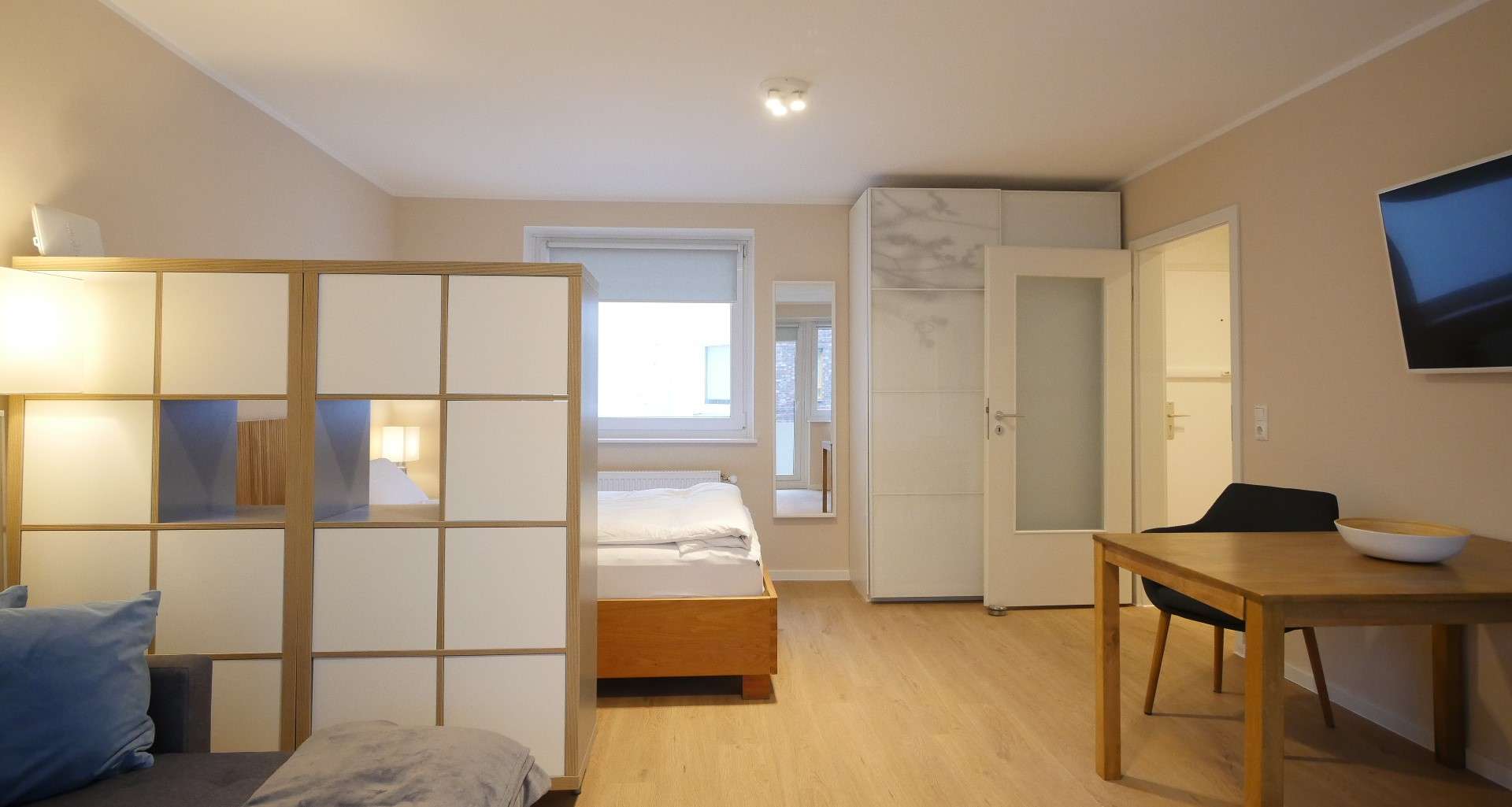 Eine Regalwand als Raumtrenner separiert das Wohn-/Schlafzimmer in zwei Bereiche. Der Schlafbereich verfügt über ein Doppelbett (140cm) mit hochwertiger Matratze und einem großen Kleiderschrank. Im Wohnbereich befindet sich ein großes Sofa mit kleinem Beistelltisch, Flachbildschirm TV und einen modernen Esstisch mit vier Stühlen.