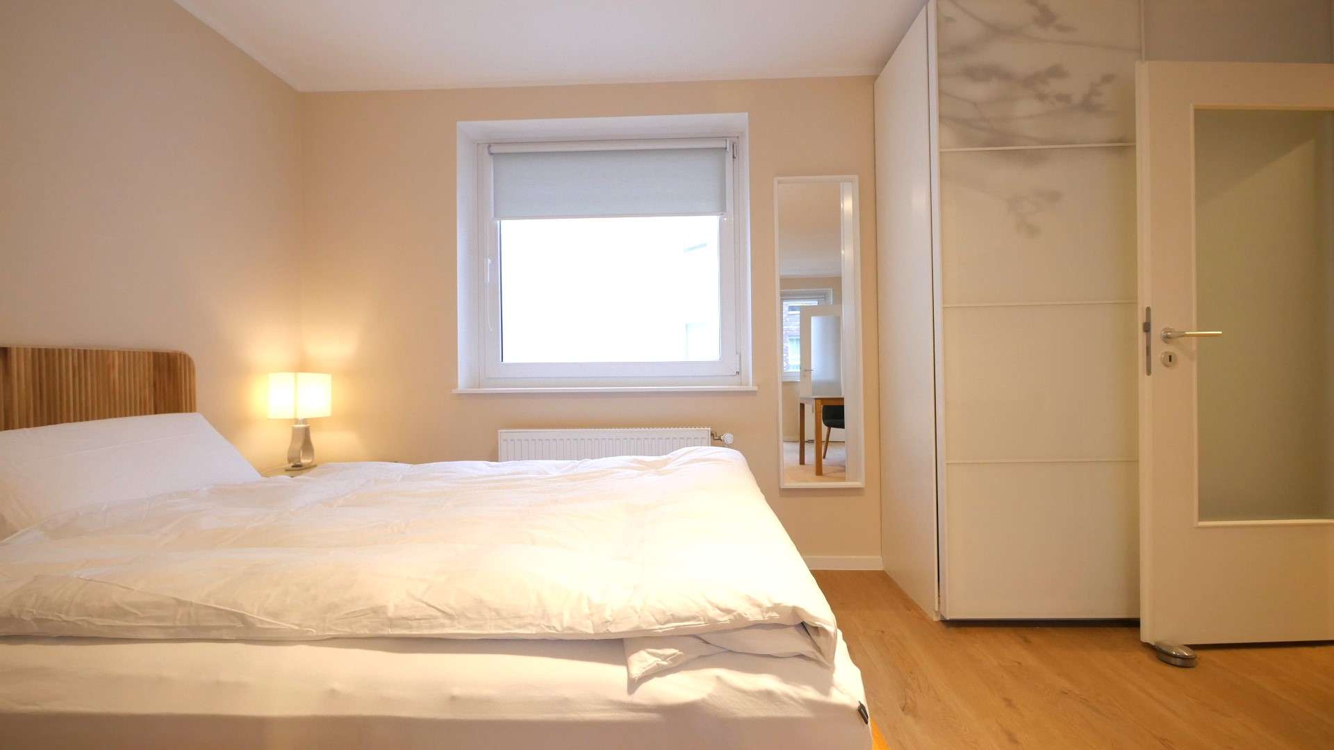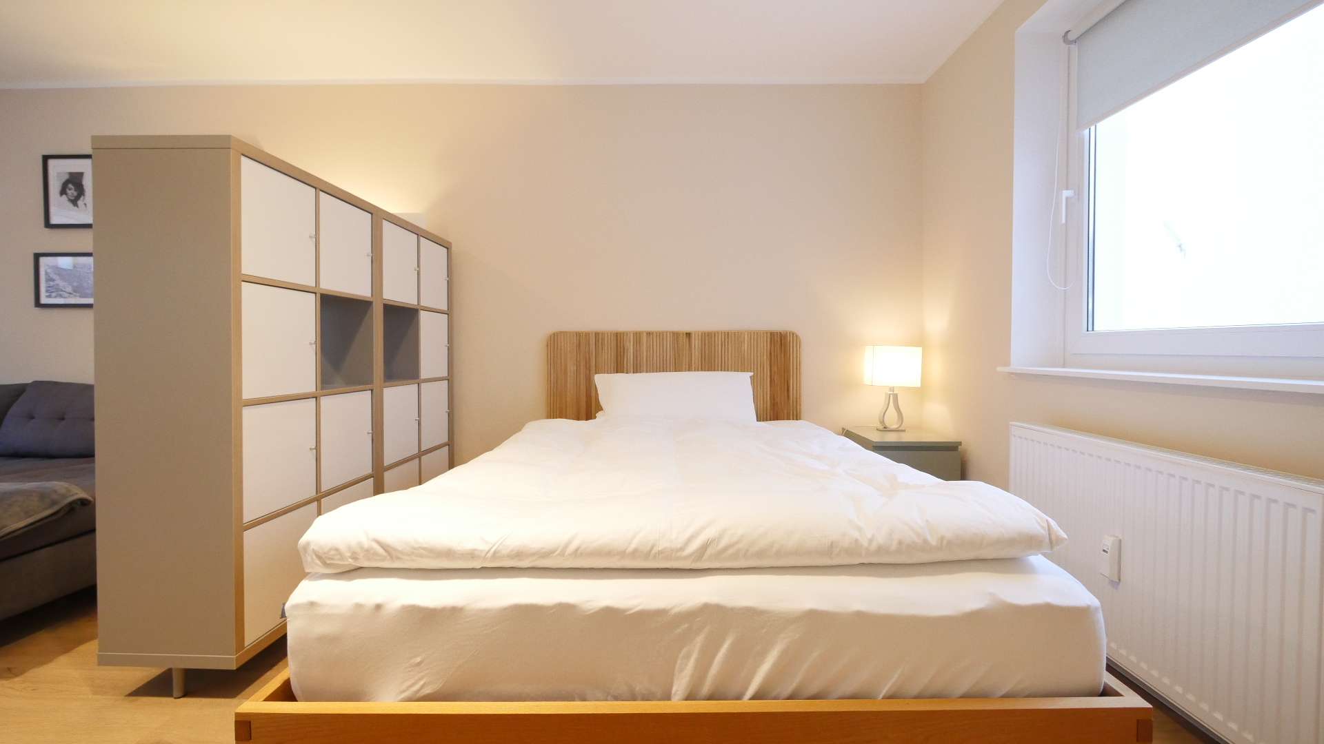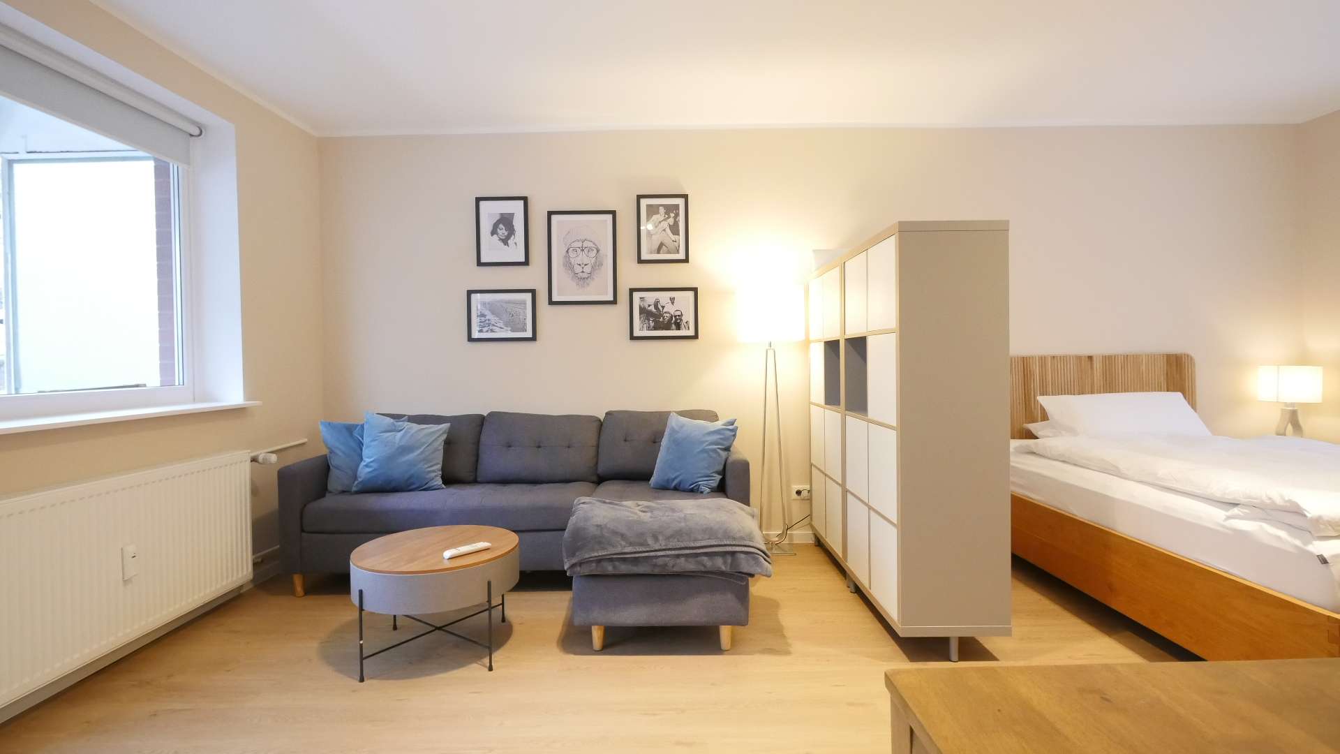 Eine Regalwand als Raumtrenner separiert das Wohn-/Schlafzimmer in zwei Bereiche. Der Schlafbereich verfügt über ein Doppelbett (140cm) mit hochwertiger Matratze und einem großen Kleiderschrank. Im Wohnbereich befindet sich ein großes Sofa mit kleinem Beistelltisch, Flachbildschirm TV und einen modernen Esstisch mit vier Stühlen.