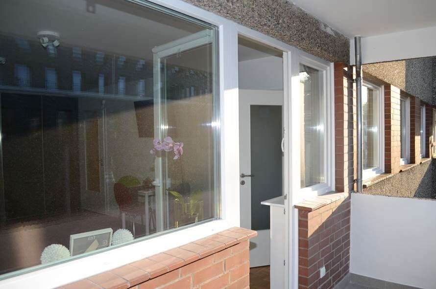 Vom großzügigen Wohn-/Schlafraum kann der Balkon betreten werden. Eine große Fensterfront läßt das Zimmer sehr hell wirken. Von hier aus kommt man auch in die Küche. Die moderne Einbauküche (Farbe Taupé mit schwarzen Griffen) wurde mit Markengeräten der Firma Bosch ausgestattet.